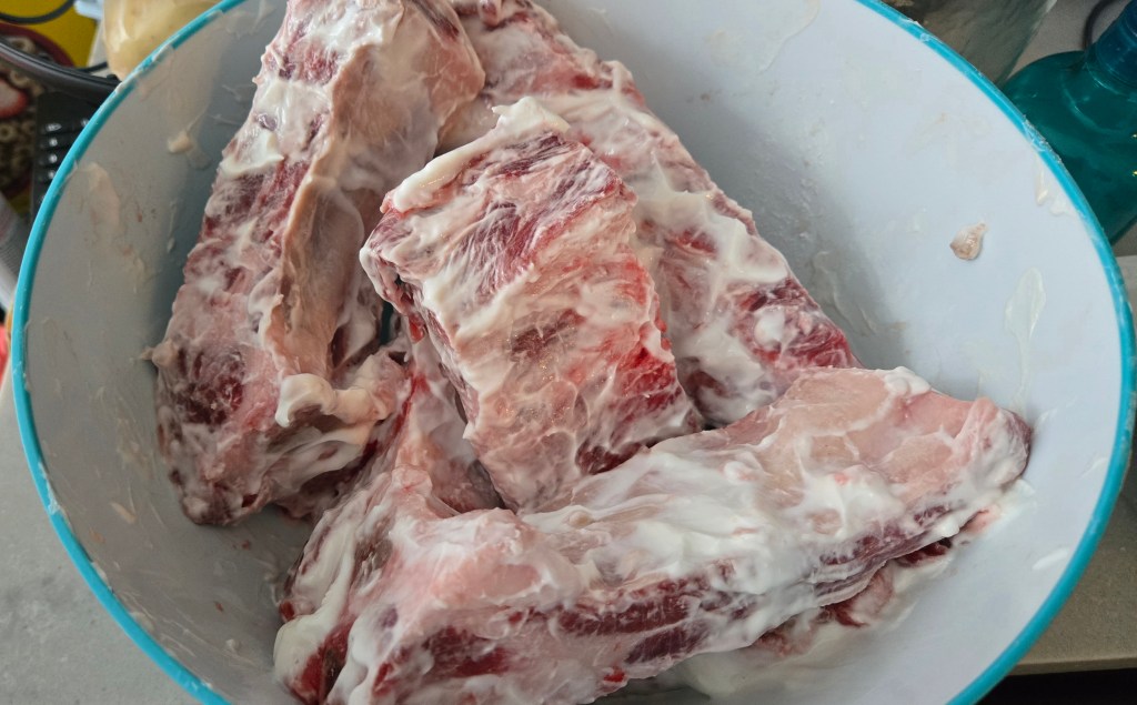 - Marinate the ribs: Coat with Greek yogurt and a little tenderizer, then set aside while you prep the rest.