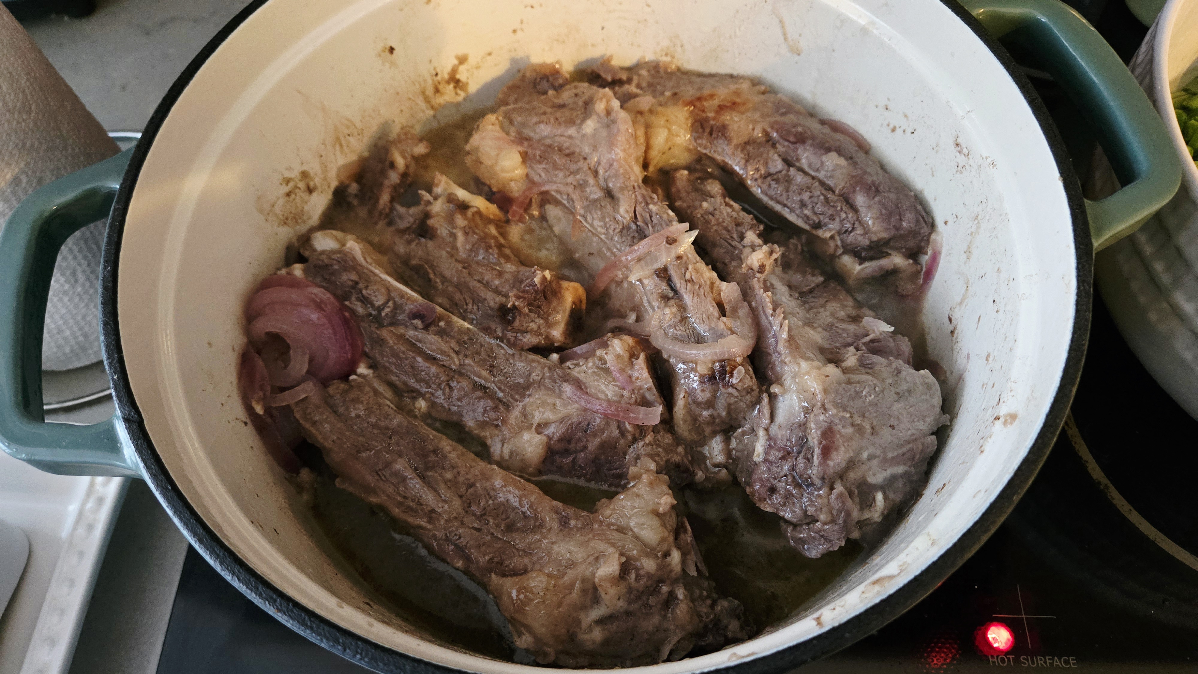 - Slow cook: Cover with a lid and let it cook on low heat for 1.5–2 hours. Stir occasionally to make sure the ribs brown on each side.