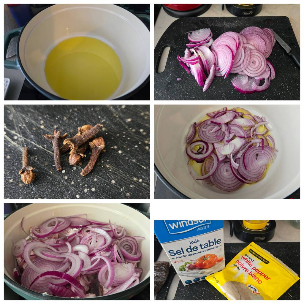 - Heat the pot: In your Dutch oven, warm olive oil. Add half the onions in a layer, followed by the cloves.