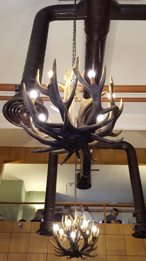 The next morning, well, late morning, I stopped at a little American-style breakfast spot. It was pretty cool inside, with big moose horns hanging as chandeliers. I kept it simple: back bacon, eggs, tomato, and some bread on the side. Just enough to fuel me up before catching my train to London.