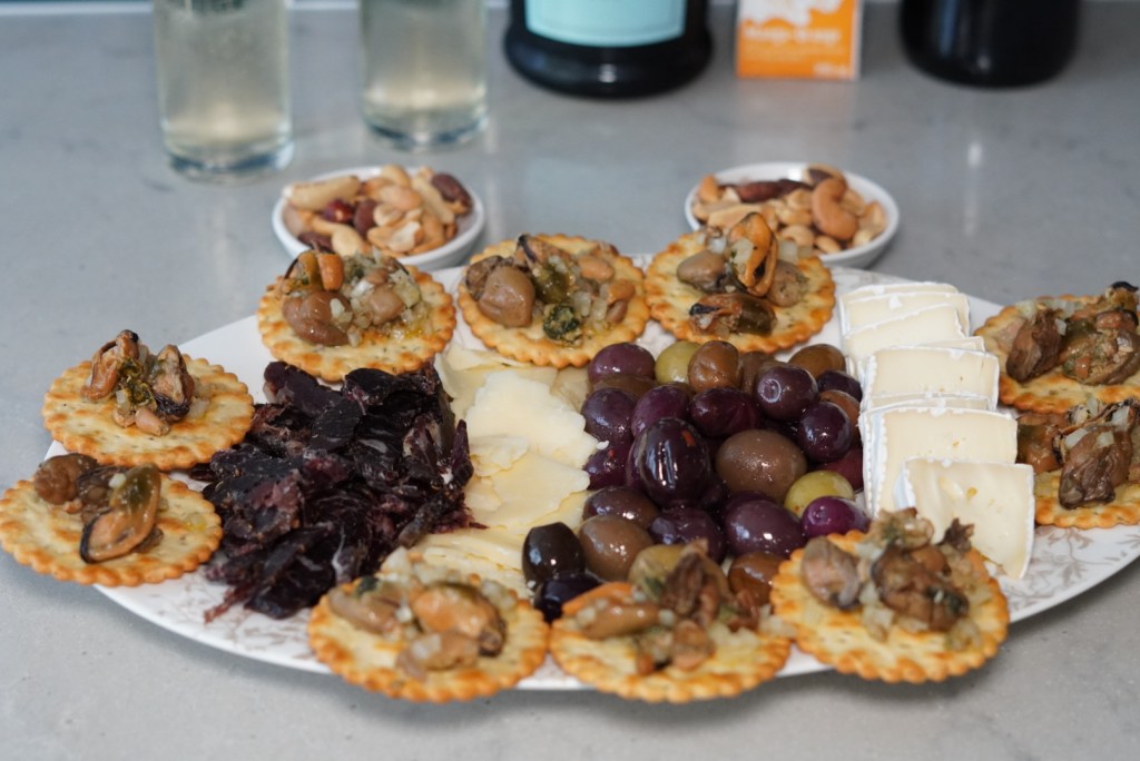We started our Christmas food adventure with appetisers. I put together a platter, charcuterie-board style, with biltong, cheddar, brie, olives, and the most delicious smoked mussels and oysters with a zesty twist, served on crackers. The whole platter felt decadent and indulgent in the best way. These were our starters, enjoyed with a glass of prosecco and a snack bowl sized of nuts on the side.