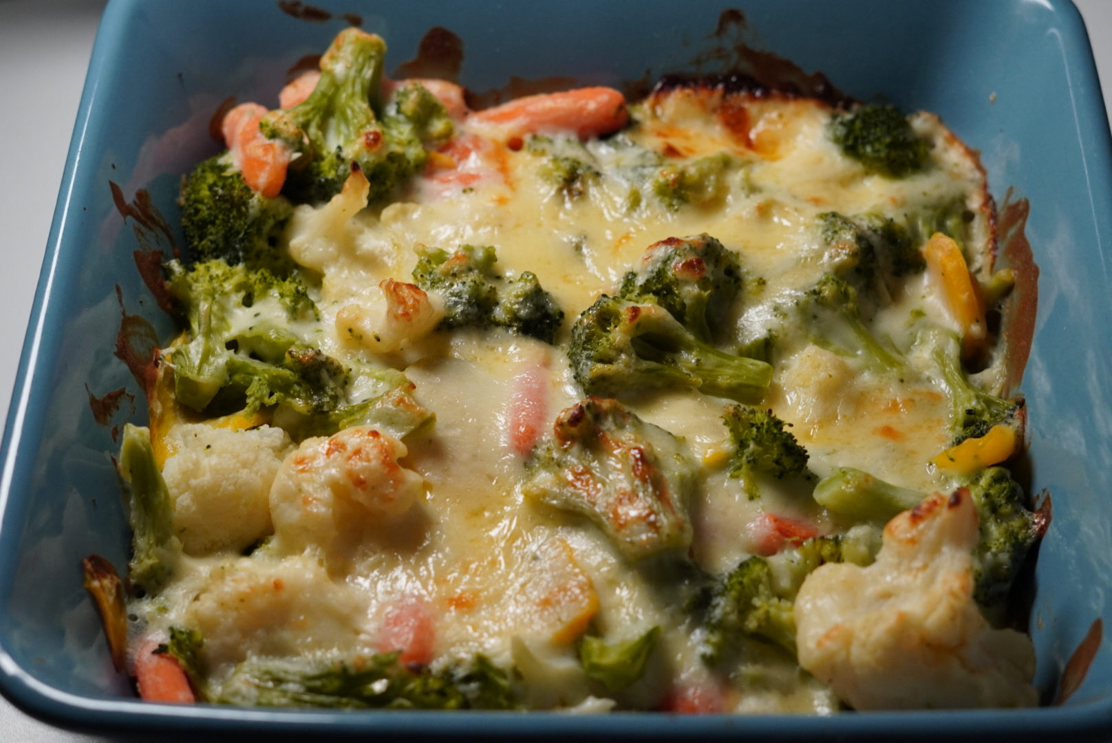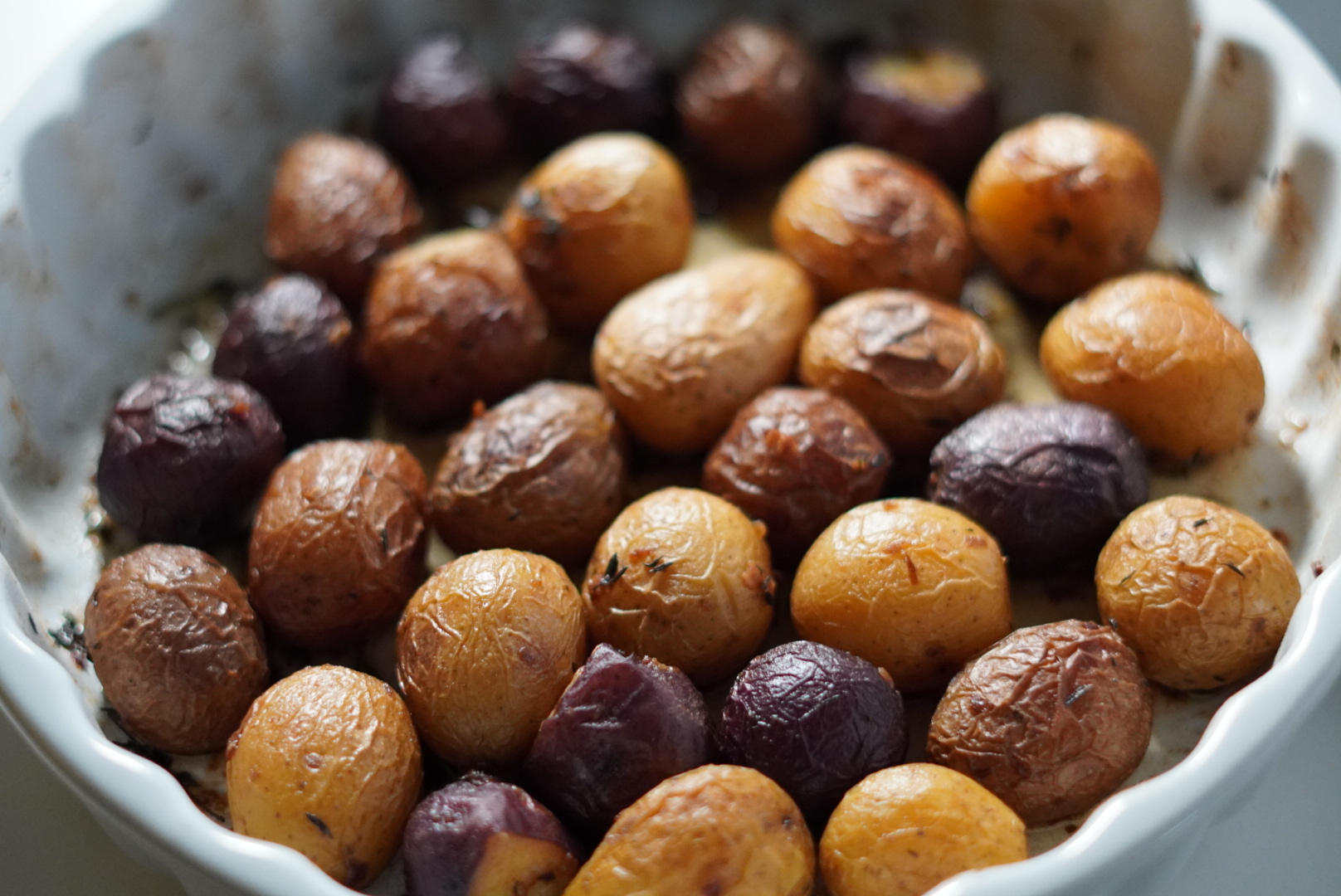 For the sides, we had a vegetable bake with a creamy white sauce, cheddar, and thyme. And then baby potatoes, roasted in butter with thyme and garlic. Comforting, familiar, and perfect alongside the mains.